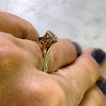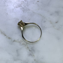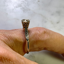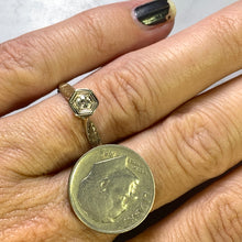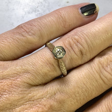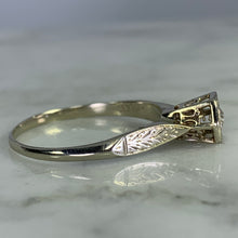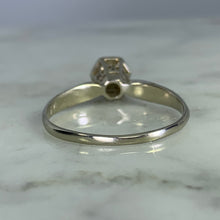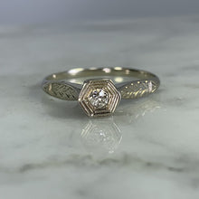 This is a very pretty art deco diamond ring in a unique 14k white gold setting. The face has a gold hexagon pocket setting for the diamond, quite unusual. This is such a classic and would make a wonderful engagement ring or promise ring.