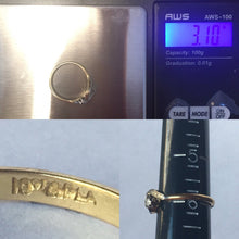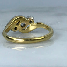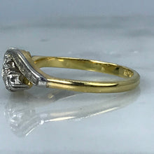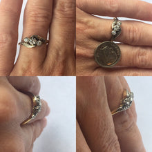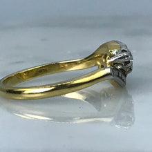 This is a very pretty art deco diamond ring in an art deco 18k yellow gold and platinum setting. It has three sparkling diamonds with a total carat weight of 0.16. This is such a classic and would make a wonderful engagement ring or promise ring.