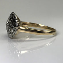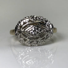 Very pretty art nouveau filigree shield ring with a very sparkly diamond set in 14K white and yellow gold. If your girl is a true vintage lover this would make a perfect and unique engagement ring.