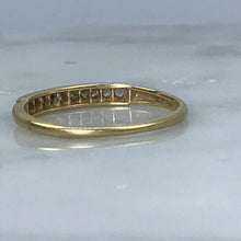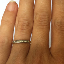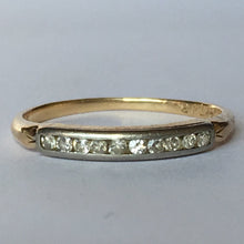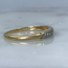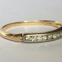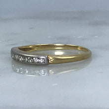 This is a beautiful diamond wedding band set in 14k white and yellow gold. It would make a lovely wedding band or stacking ring.