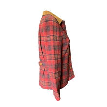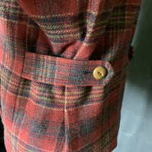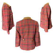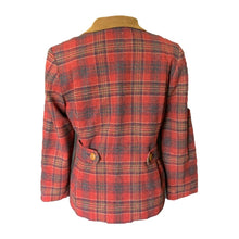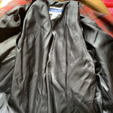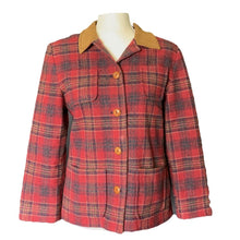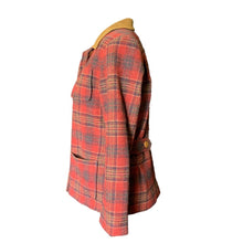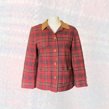 This is the perfect fall jacket! It is a 1990s wool riding jacket by Pendleton in a red and brown plaid wool with a suede collar. Very on point for the "Equestrian Chic" trending fashion for fall.
